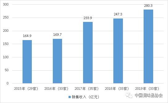 ? ? ? 2015-2019年百?gòu)?qiáng)企業(yè)醬油產(chǎn)業(yè)銷(xiāo)售收入分別為:164.9億元、169.7億元、233.9億元、247.3億元、280.3億元。