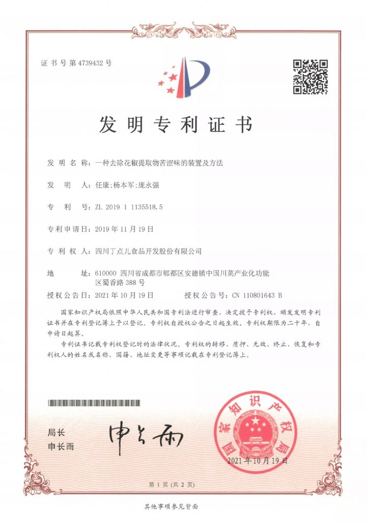 ? ? ? ?近日,丁點兒股份創(chuàng)新研發(fā)出《一種去除花椒提取物苦澀味的裝置及方法》并獲得國家發(fā)明專利授權,這是公司在花椒及花椒制品研究方面取得的第4項國家發(fā)明專利。