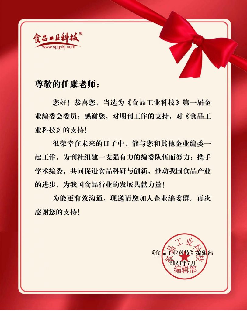 《食品工業(yè)科技》第一屆企業(yè)編委的選拔要求候選人具有高級專業(yè)技術職稱、較高的學術造詣、良好的行業(yè)口碑以及在推動行業(yè)技術創(chuàng)新做出重要貢獻。