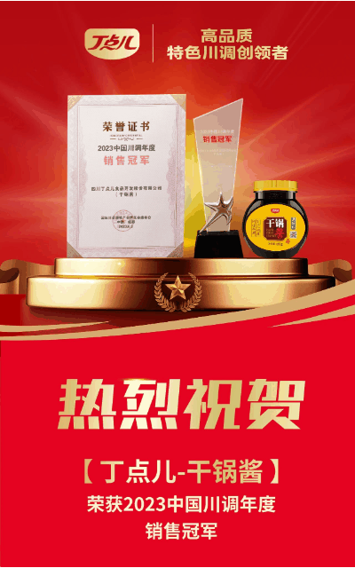丁點兒干鍋醬、椒麻雞汁、藤椒油、麻得倒紅花椒油、老壇酸菜醬等產品更是在“中國川調之夜”大放異彩,獲得了品類銷售冠軍、品類十大創新產品、品類十大影響力品牌等多個獎項。
