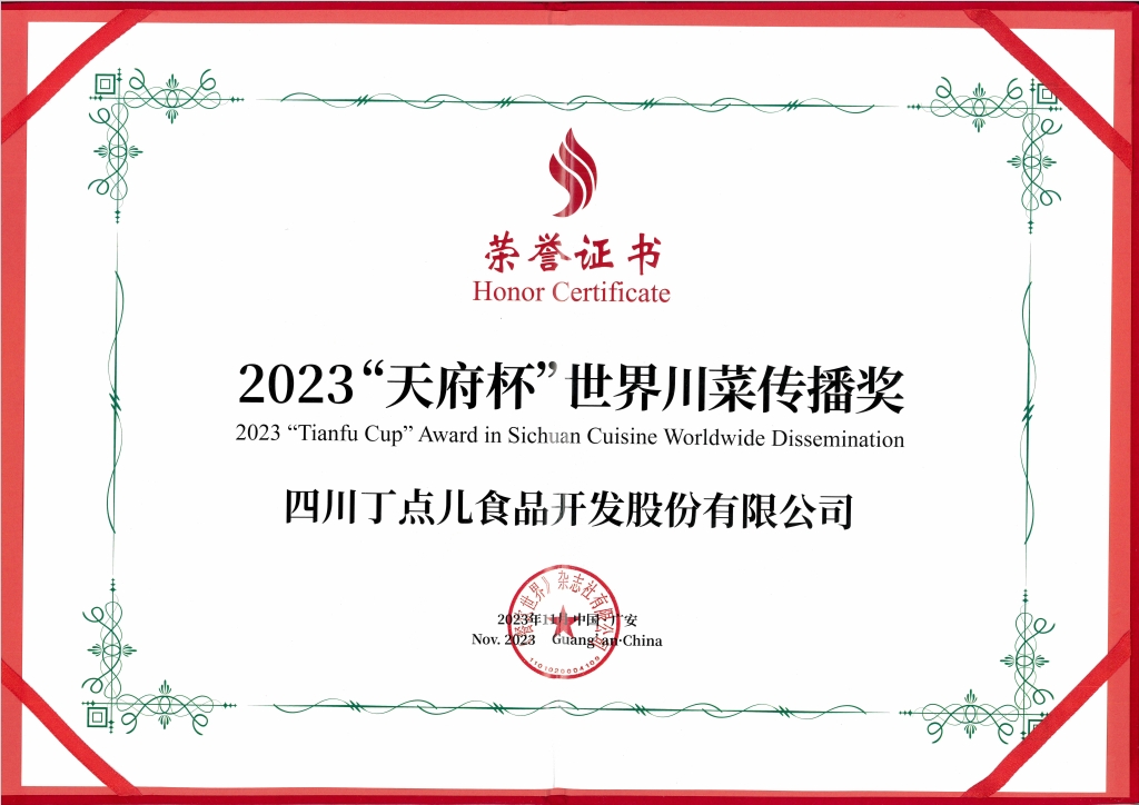 憑借出色的企業影響力和巨大的發展潛力,丁點兒食品在這一年又斬獲了多項榮譽。“年度超級品牌之星”、2023“天府杯”世界川菜傳播獎、第十一屆中國食材電商節-優質企業推薦等稱號,充分展示了行業對丁點兒食品實力的肯定。