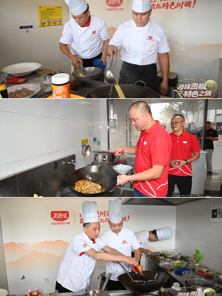 廚藝交流環(huán)節(jié),嘉賓們分組以椒麻、金湯酸菜、泡椒、干鍋四大風(fēng)味為靈感,結(jié)合丁點(diǎn)兒椒麻雞汁、干鍋醬等即興創(chuàng)作佳肴。現(xiàn)場香氣四溢,創(chuàng)意迭出。